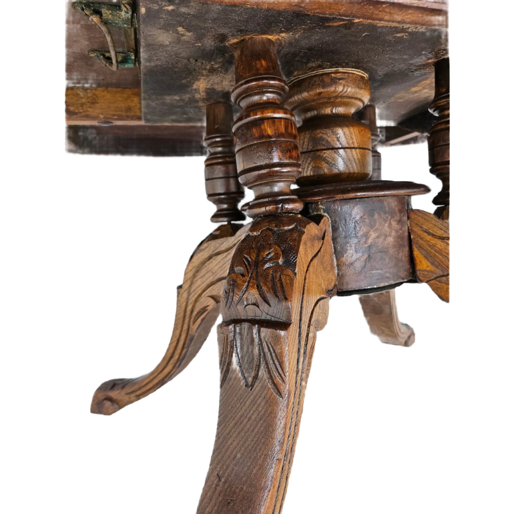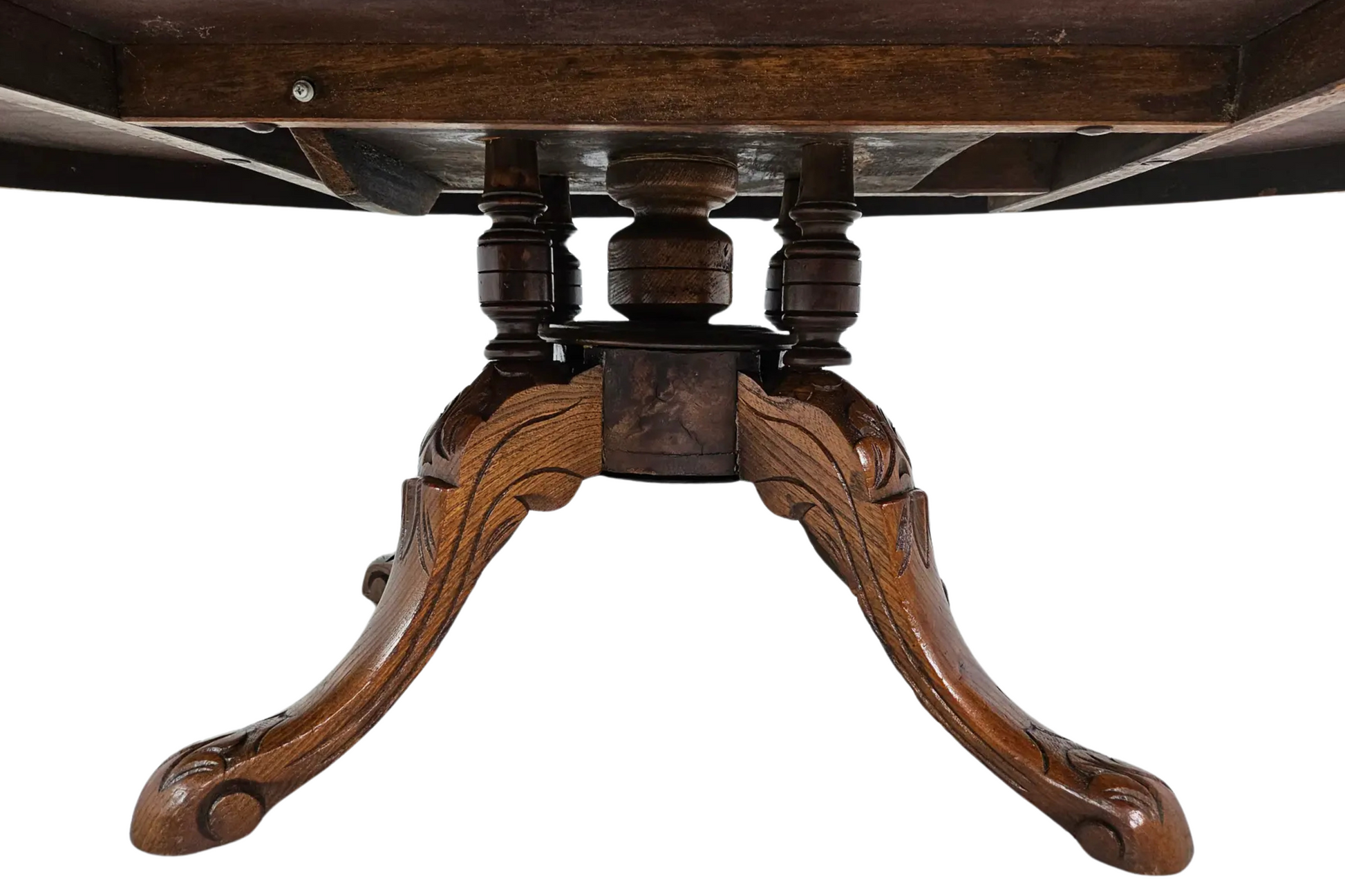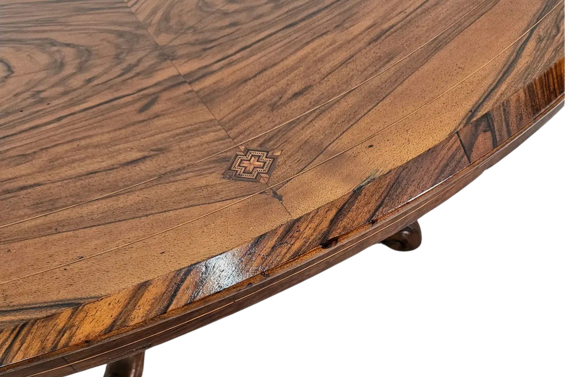 English made coffee table Rosewood top with beautiful designs. Beautiful grain and some Marquette designs. Legs are nicely carved and top is detachable with a pair of pins for easy transport. Circa 1900's