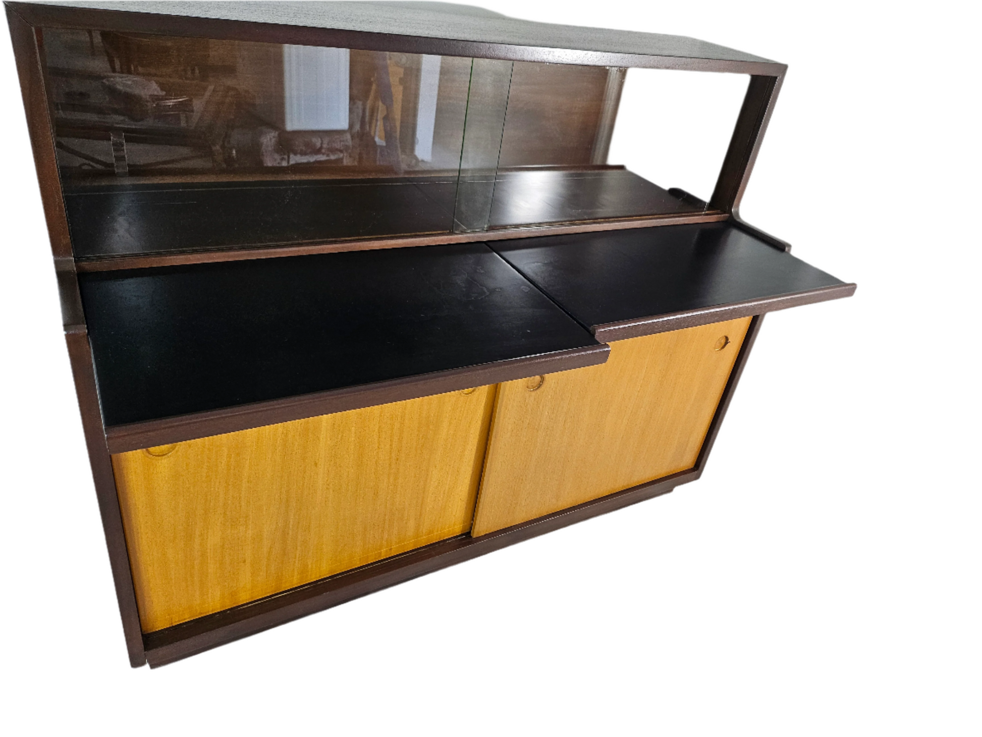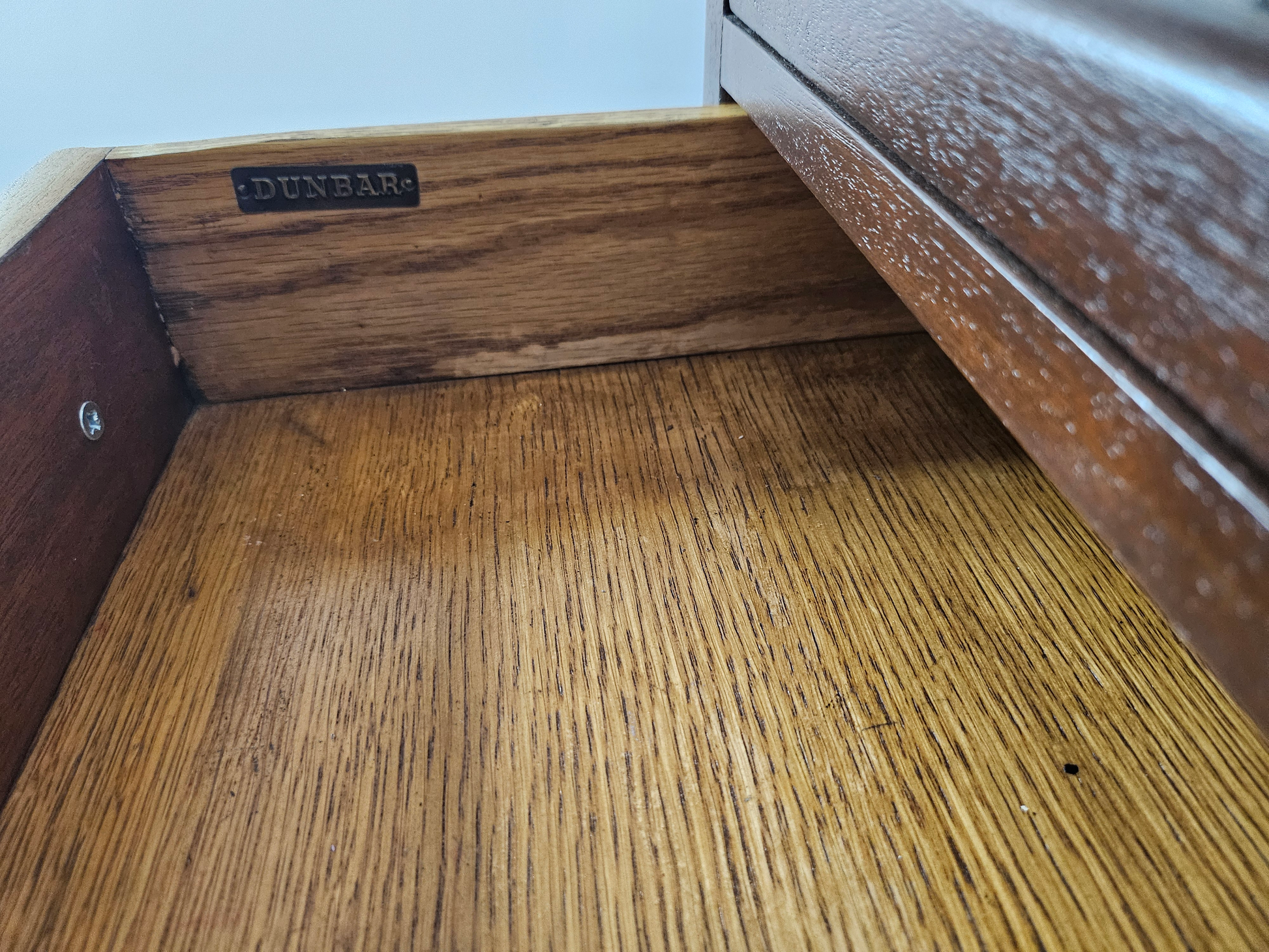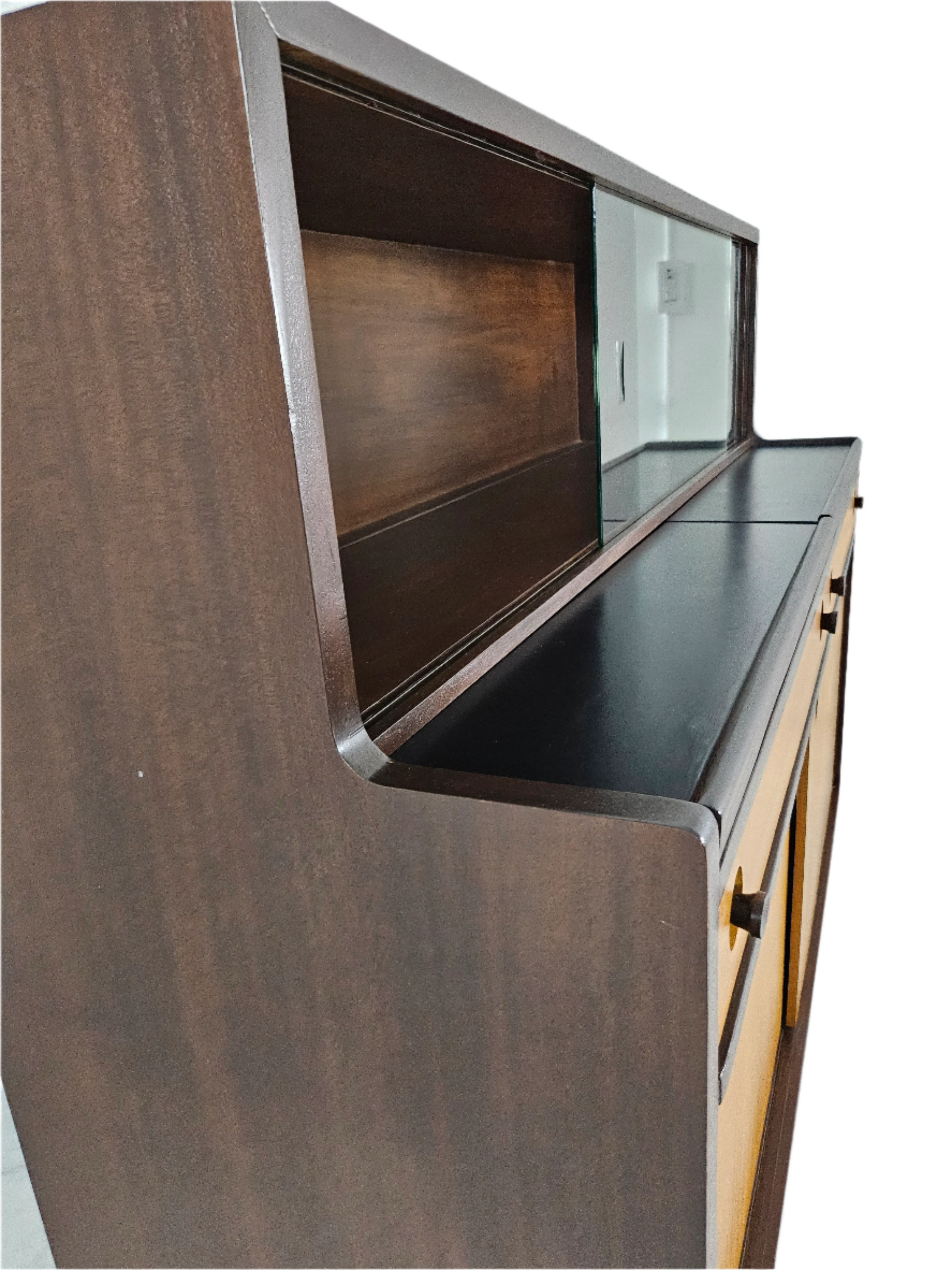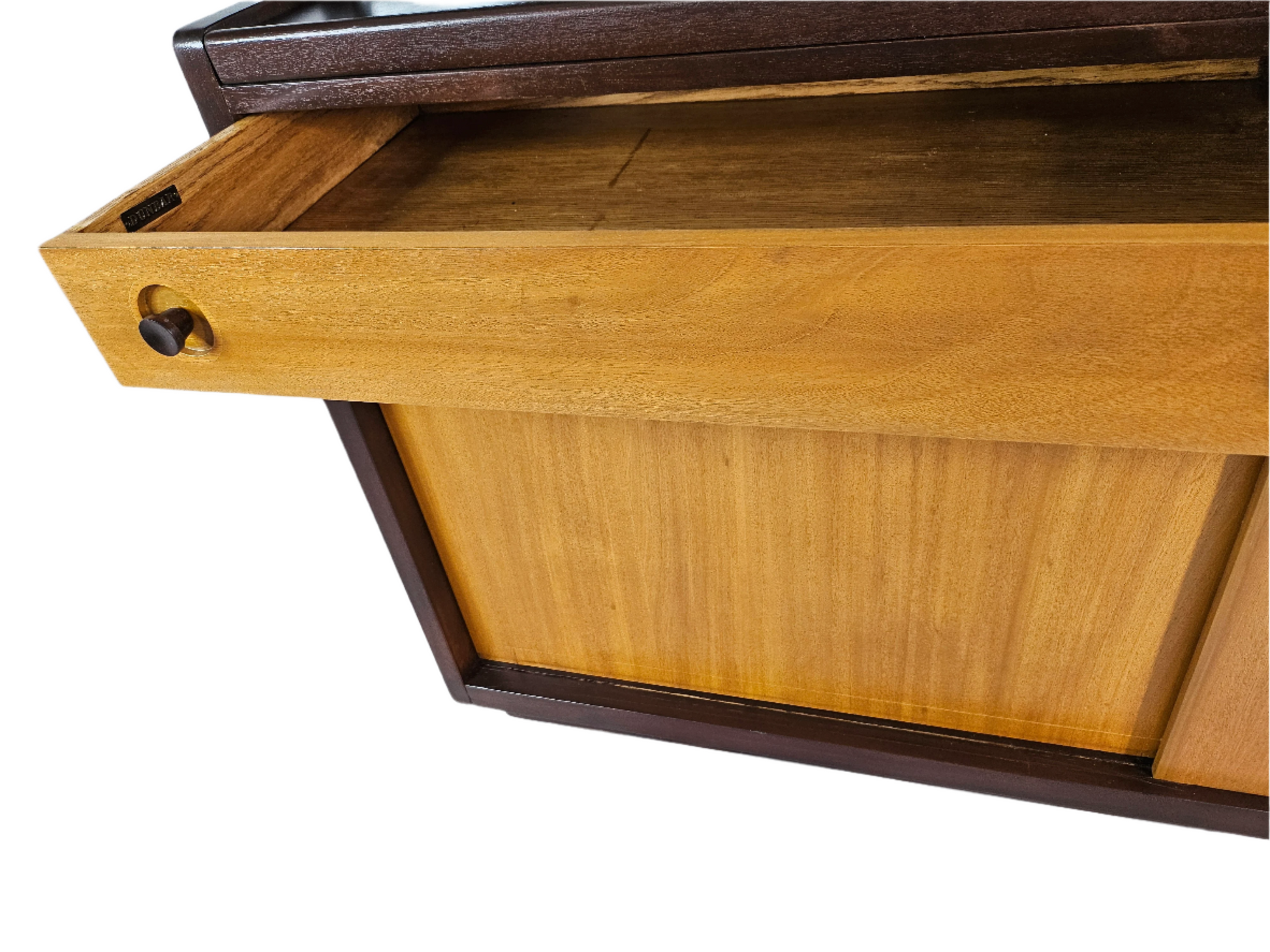 Rare find! This is a China cabinet or buffet, used for storage of table clothes, silverware and China. This cabinet was designed by Edward Wormley for Dunbar furniture company. Dunbar used different labels or plaques to identify their furniture. According to the color and shape of the plaque that this cabinet is holding this was made in the 1940's. It's made out of mahogany wood and it's been refinished to its original, dark chocolate brown and blonde bleached color.