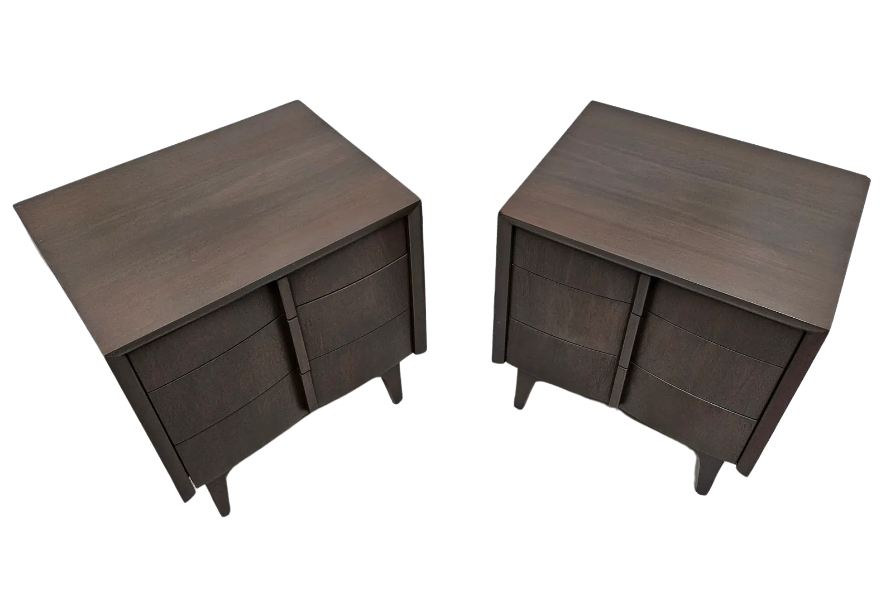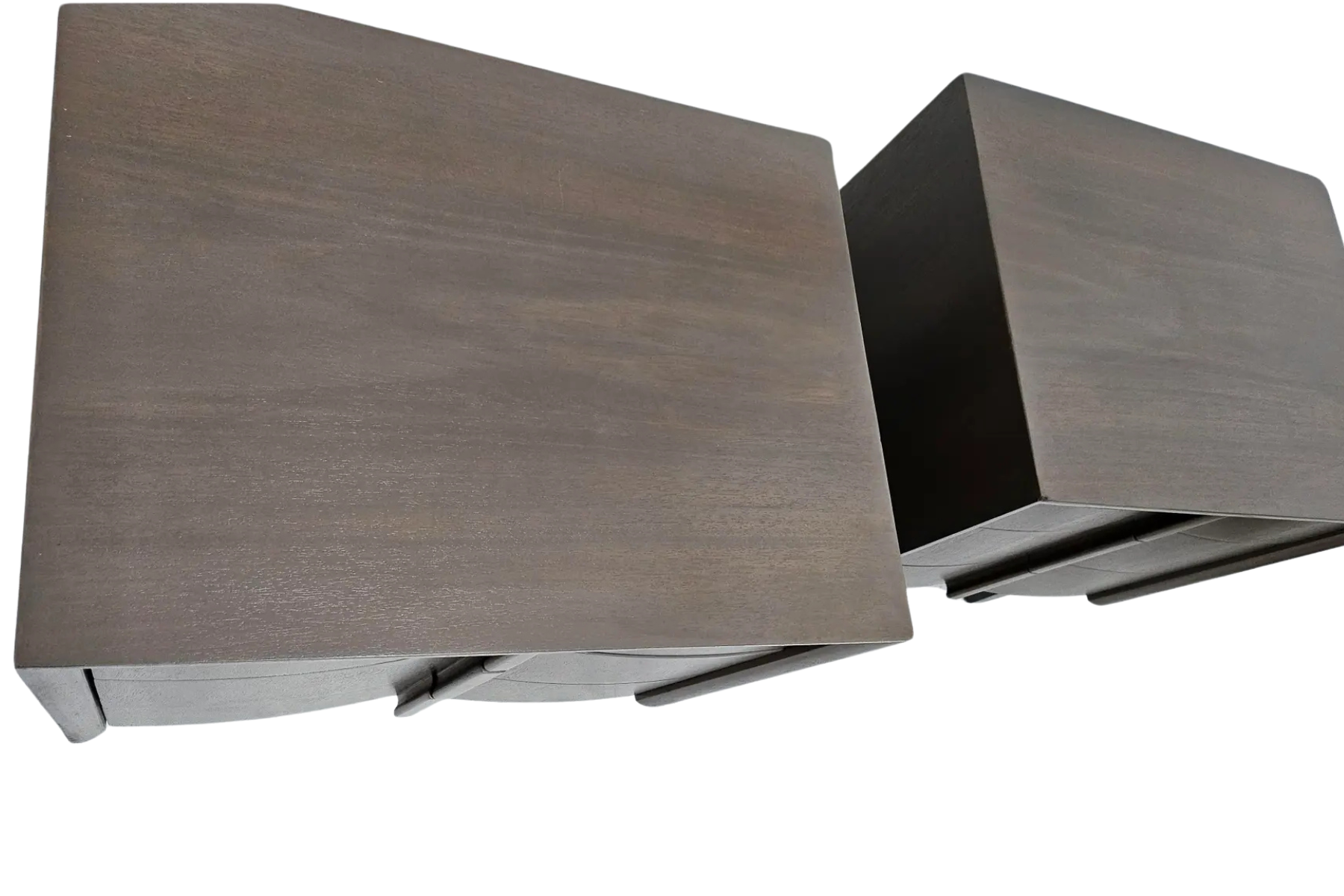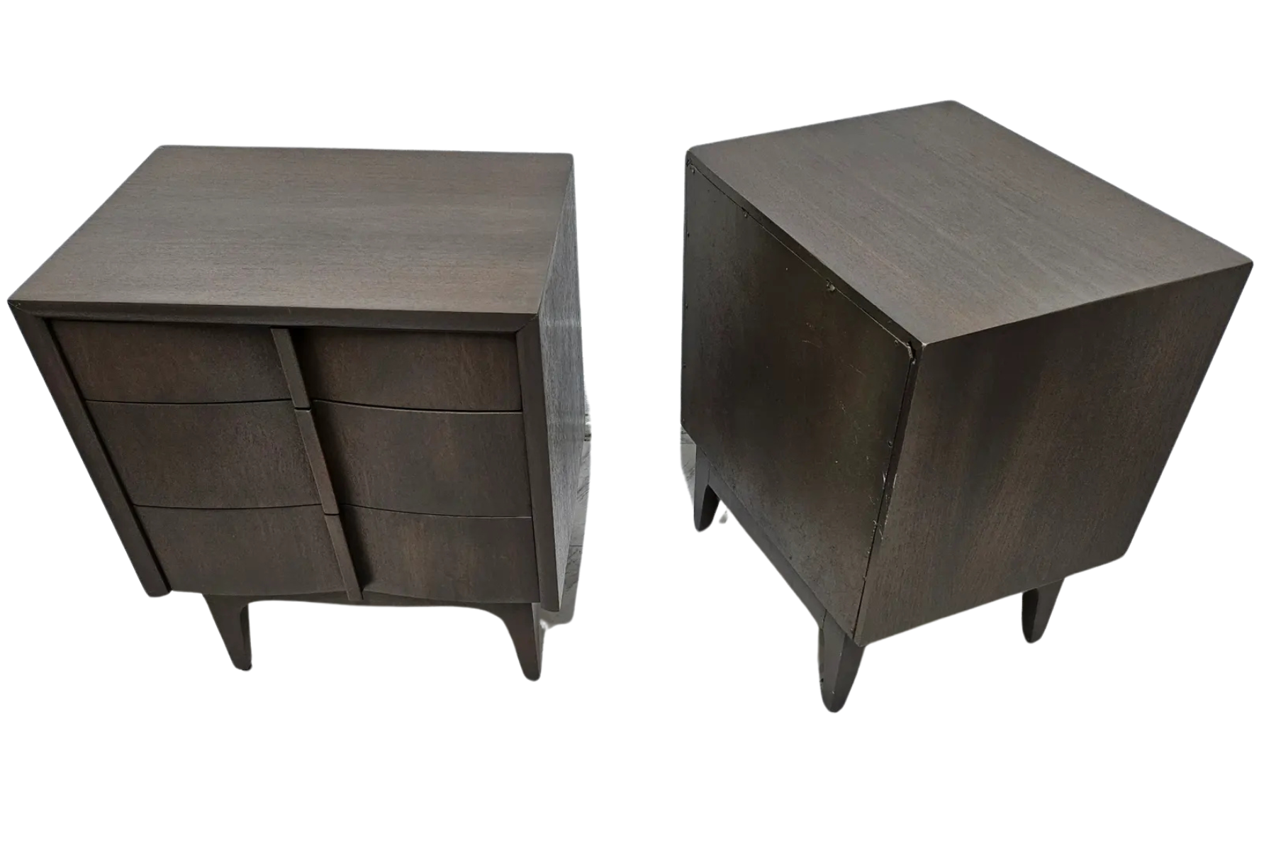 Pair of night stands made out of mahogany and finished in a gray stain showing the grain of the wood. Made by American of Martinsville Co. Circa 1960's.