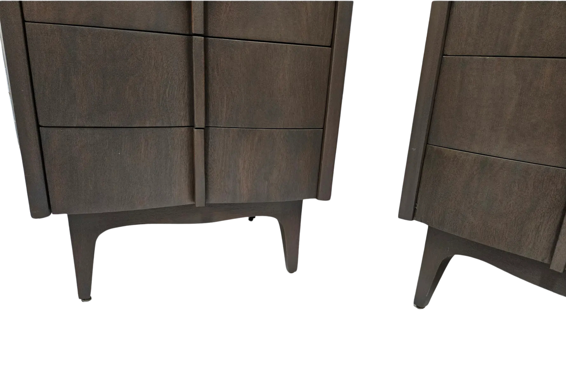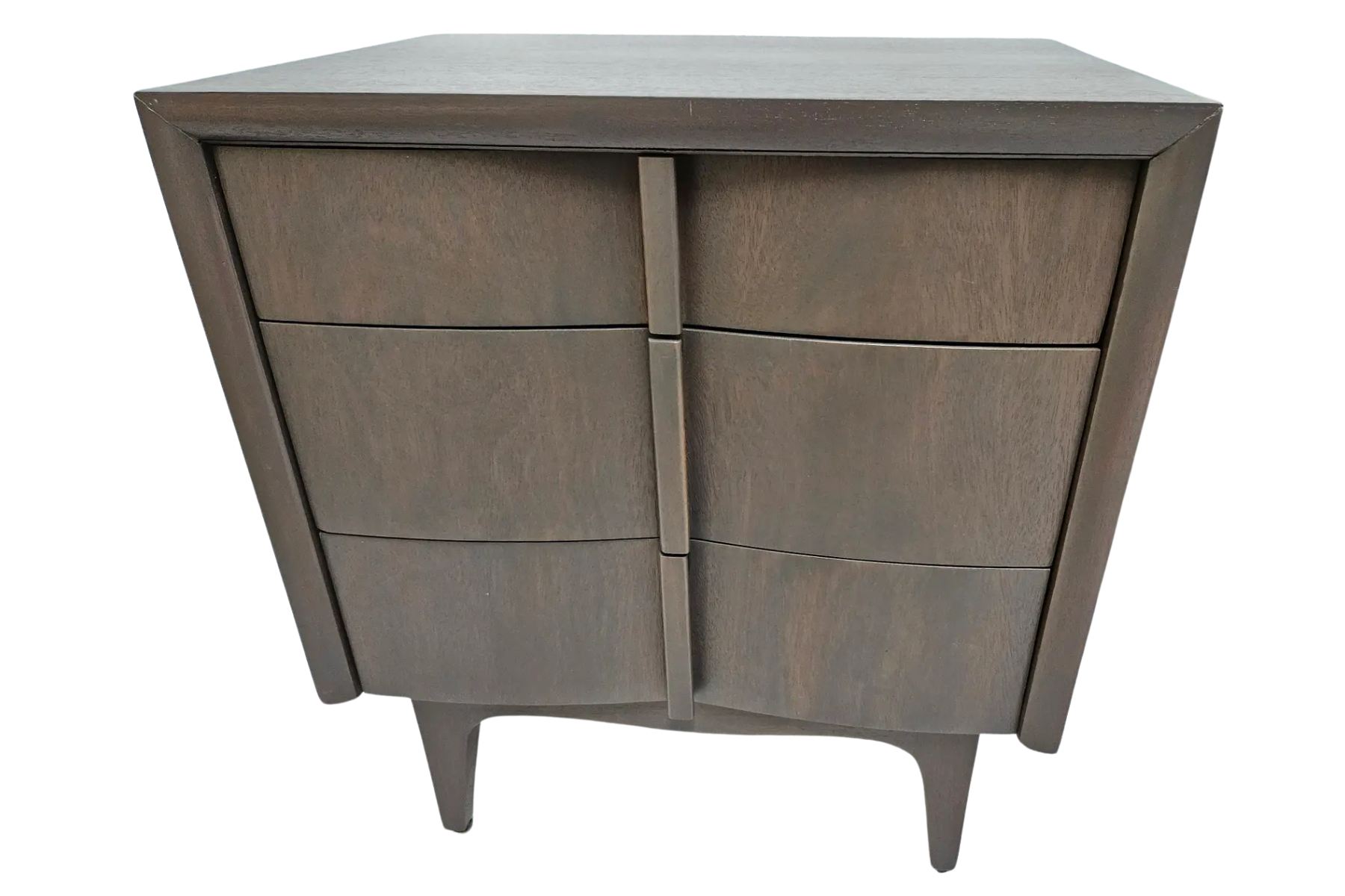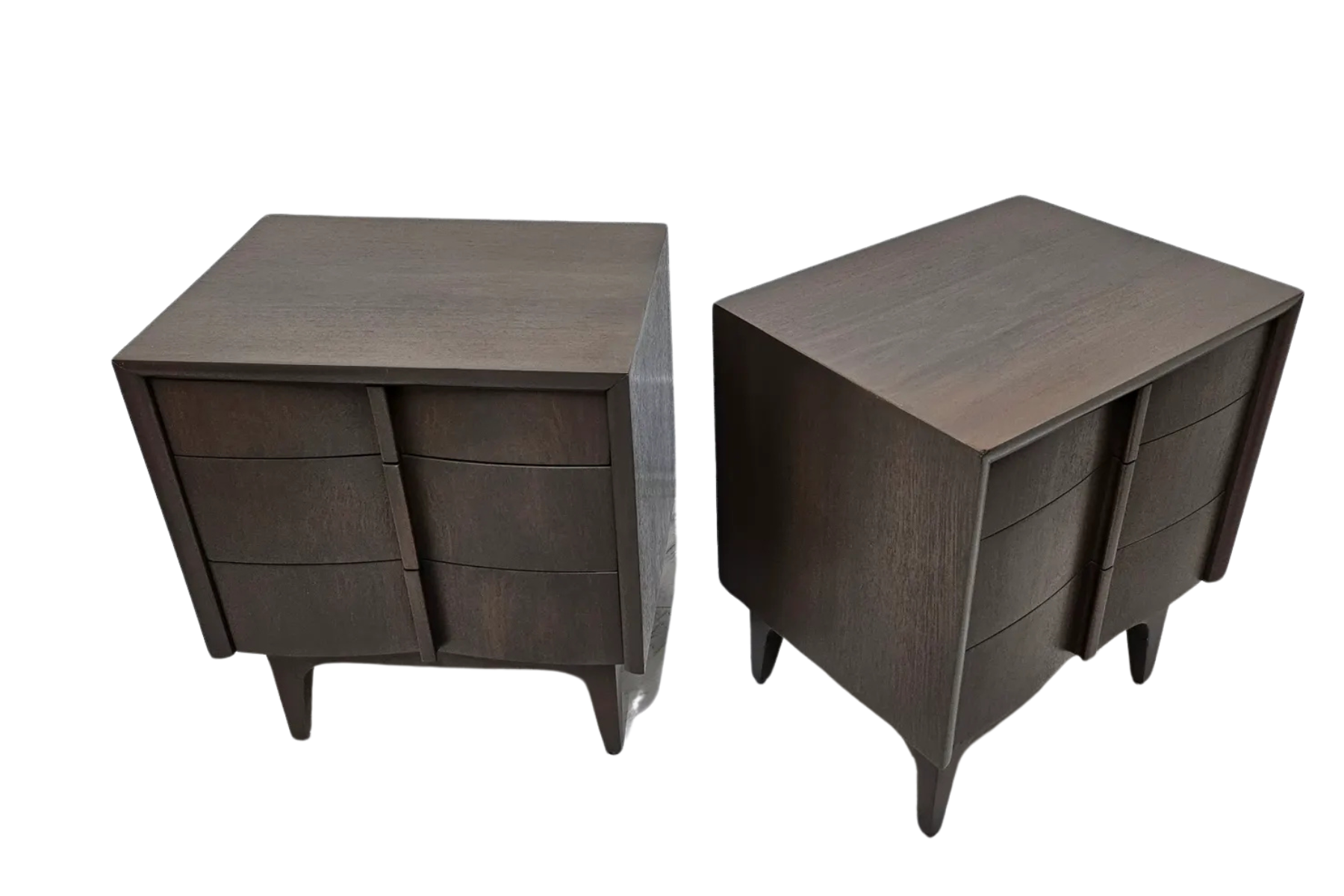 Pair of night stands made out of mahogany and finished in a gray stain showing the grain of the wood. Made by American of Martinsville Co. Circa 1960's.