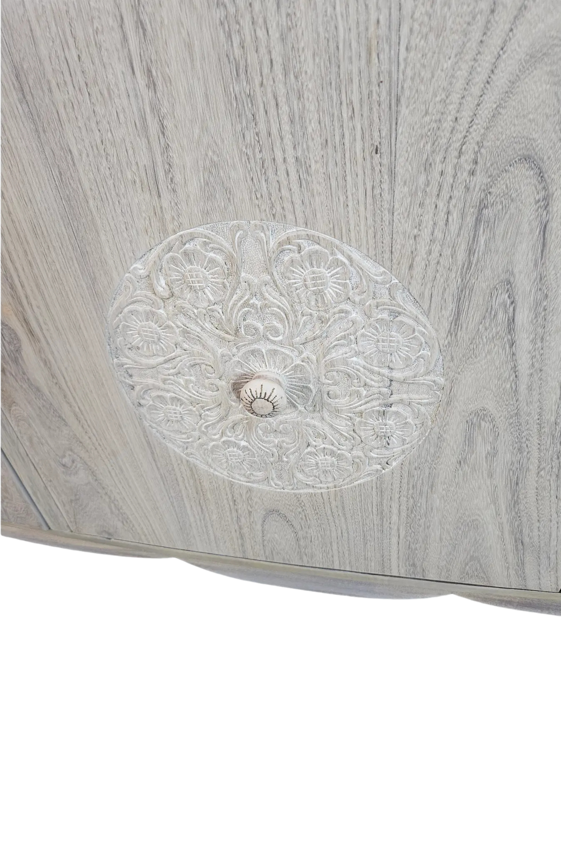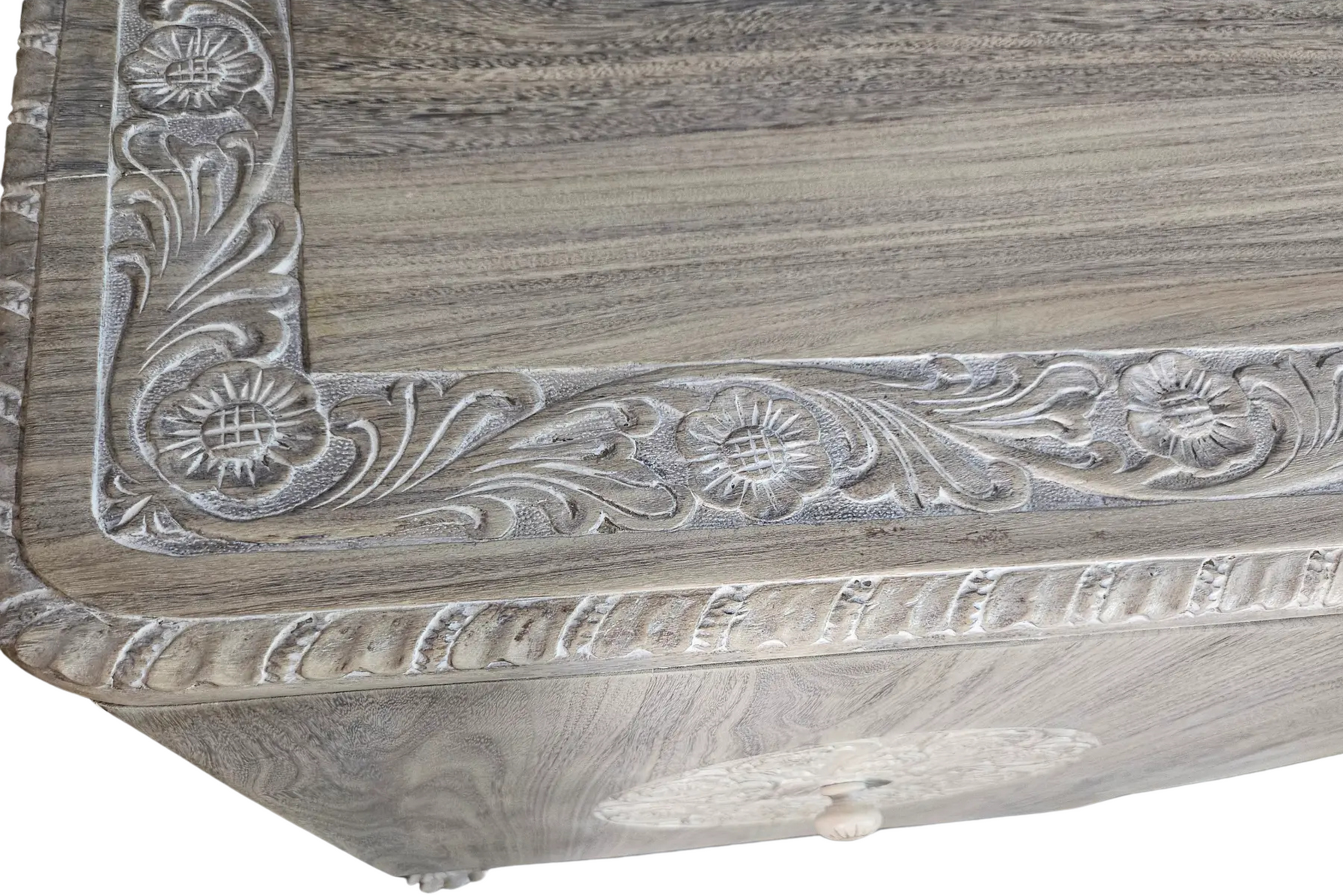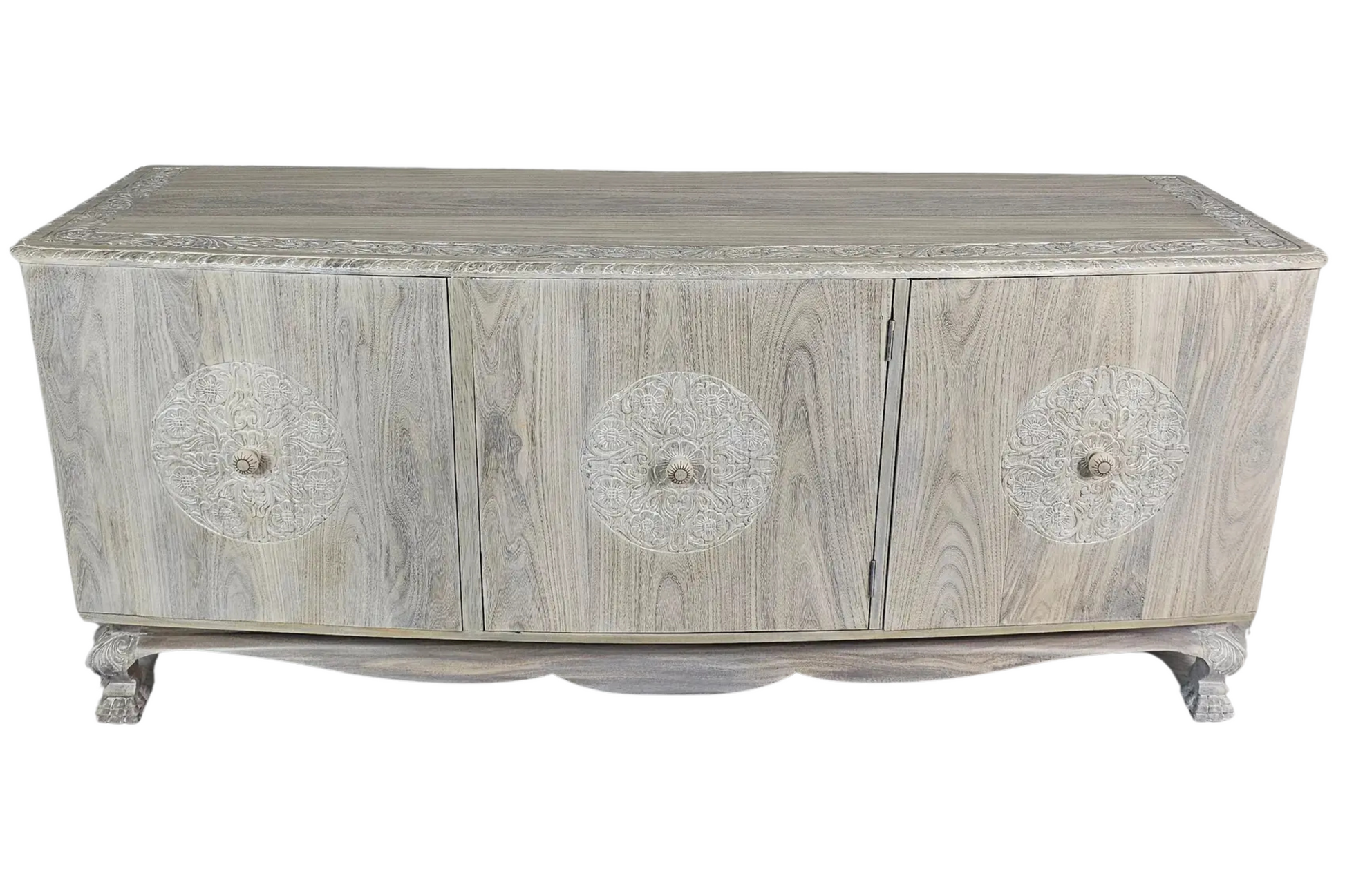 This is a custom sideboard made out of solid mahogany wood, rarely you find furniture made of solid wood meaning no veneers or plywood were used. This piece is really well made and it's been refinished in a bleached white washed, showing the grain of the wood nicely, carving detailed and claws feet. I was told they custom made it in the 1960s.