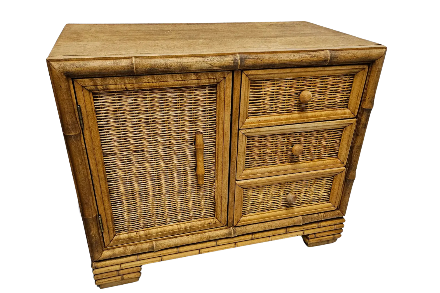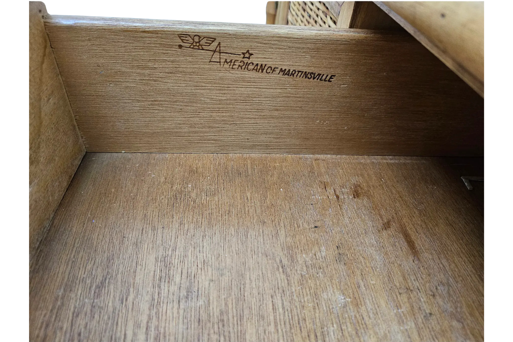 Pair of night stands made out of wood and woven rattan. Made by American of Martinsville Co. Overall in good condition, minor imperfections shown on the pictures. Circa 1970's.