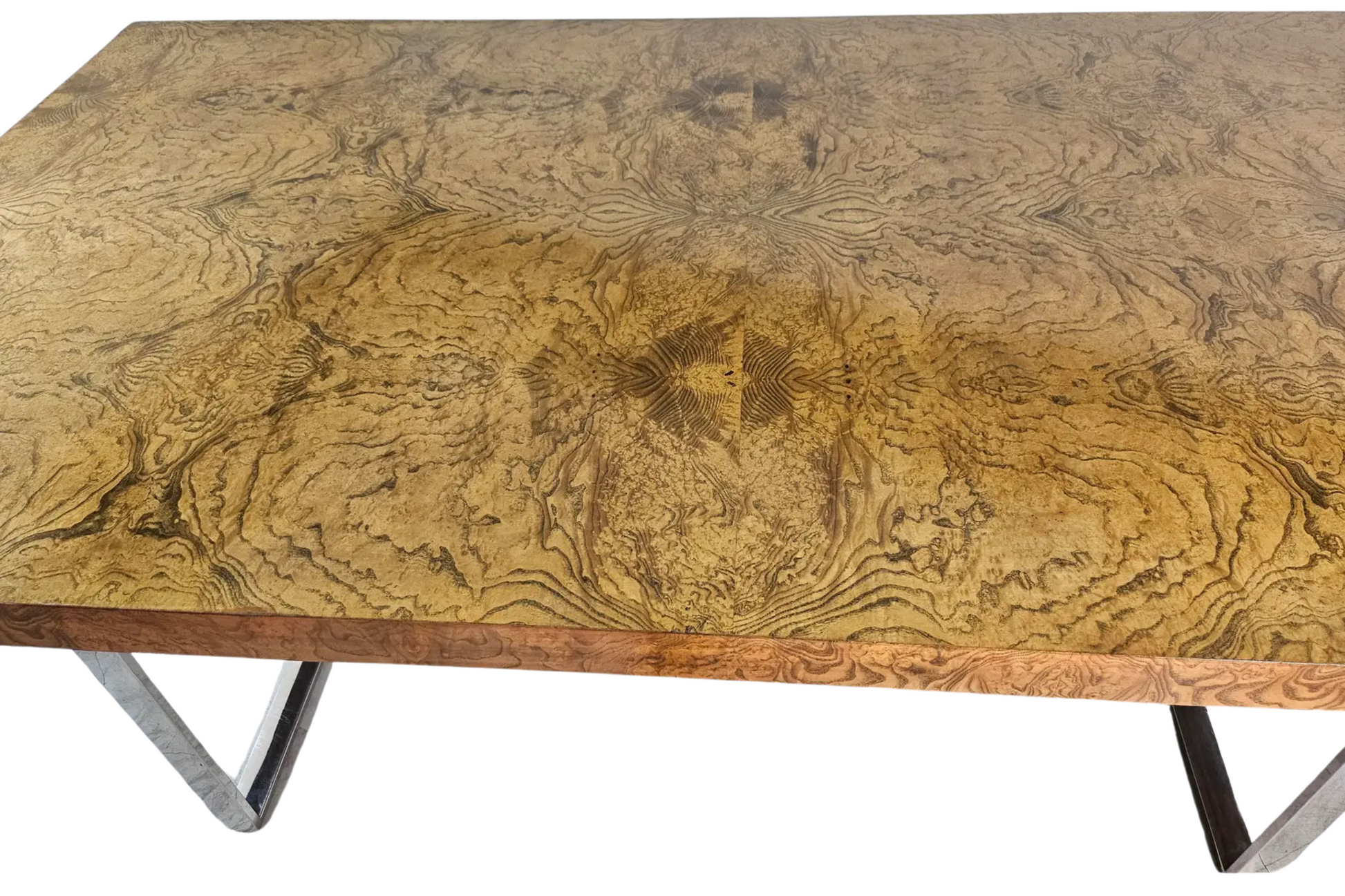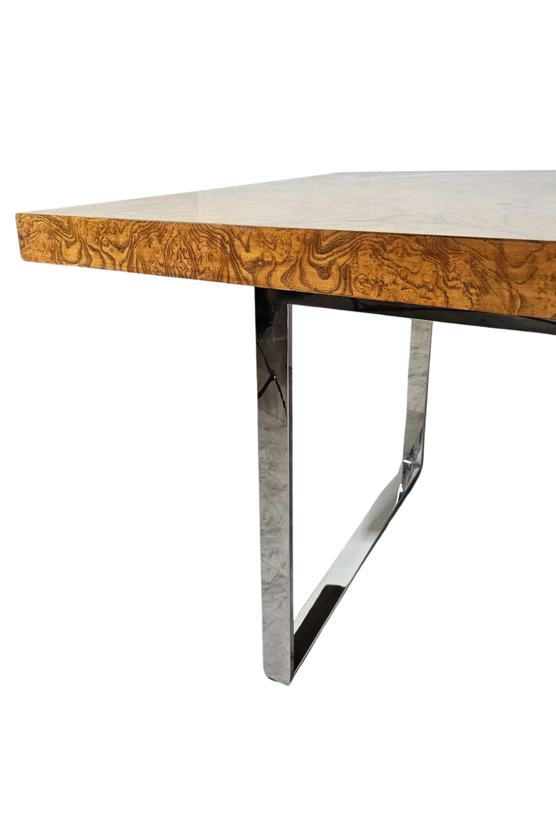 The beautiful grain of the wood makes this table very attractive, it's olive ash burl wood with a chrome base. It could be a Milo Bauhgman design but I don't have a label to prove it. It's been recently refinished so the finish is nice and shiny. Circa 1970.