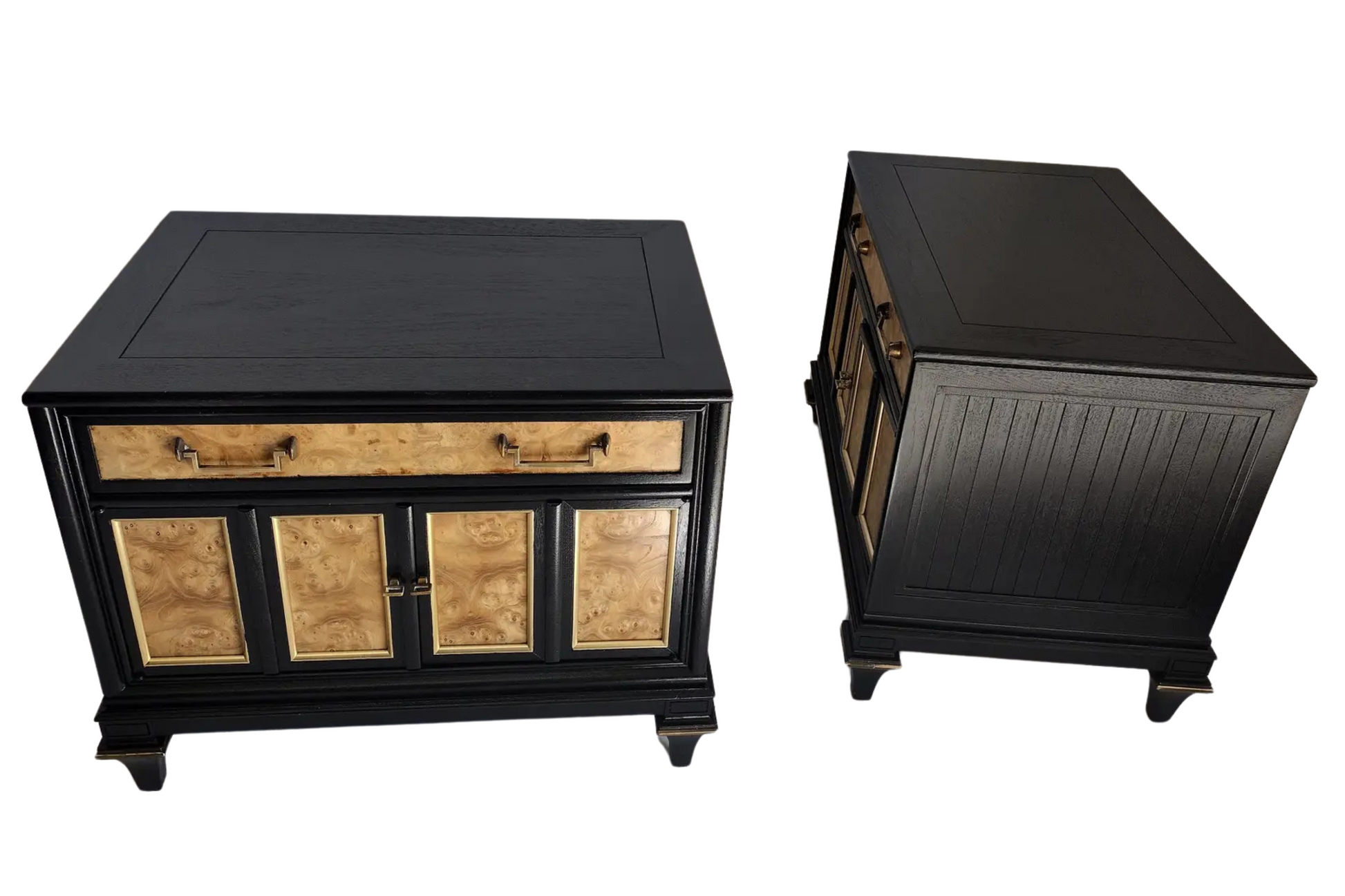 Pair of quality night stands made out of ebonized walnut with burl wood accents, brass hardware. Refinished. Really elegant.