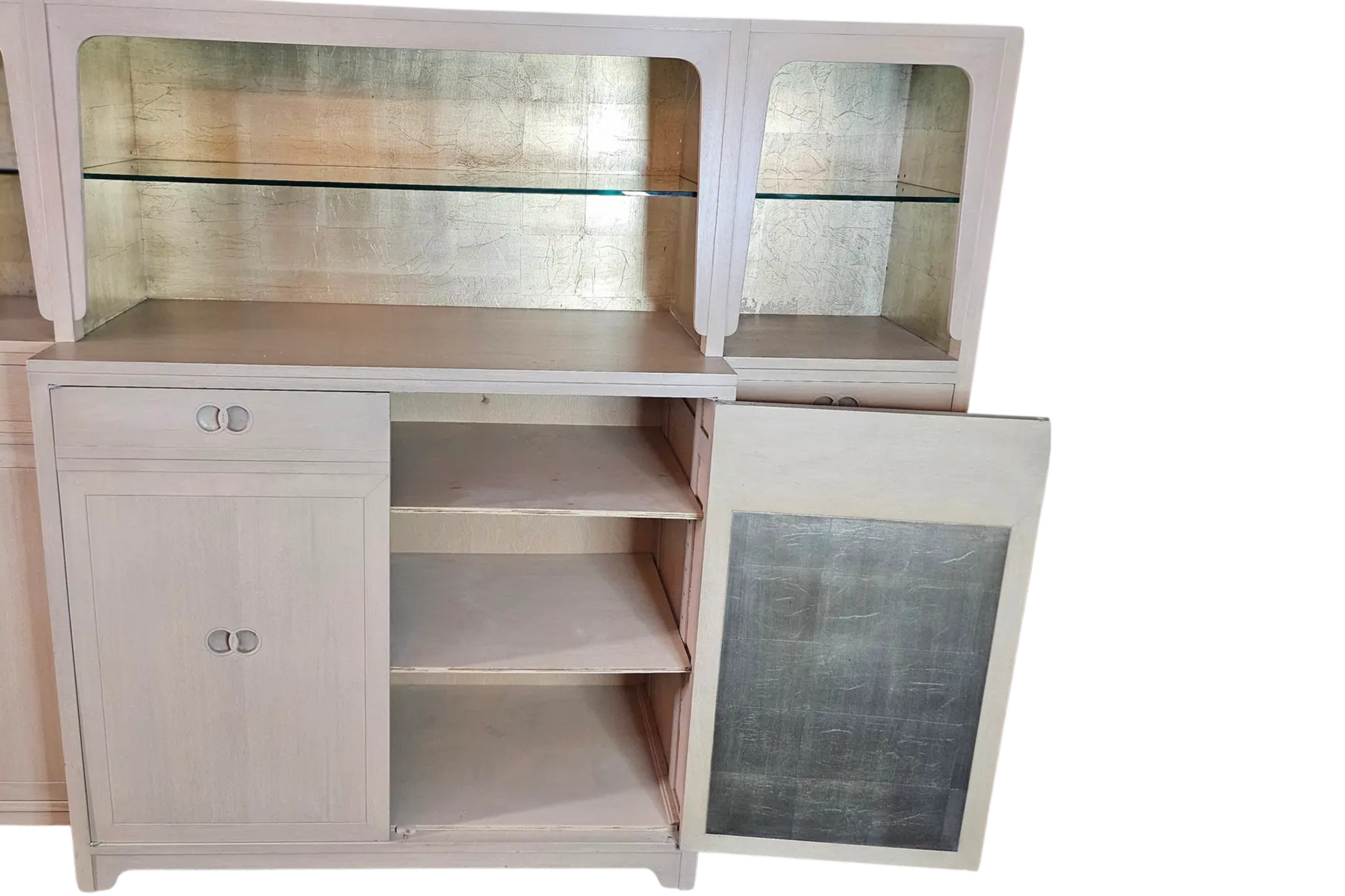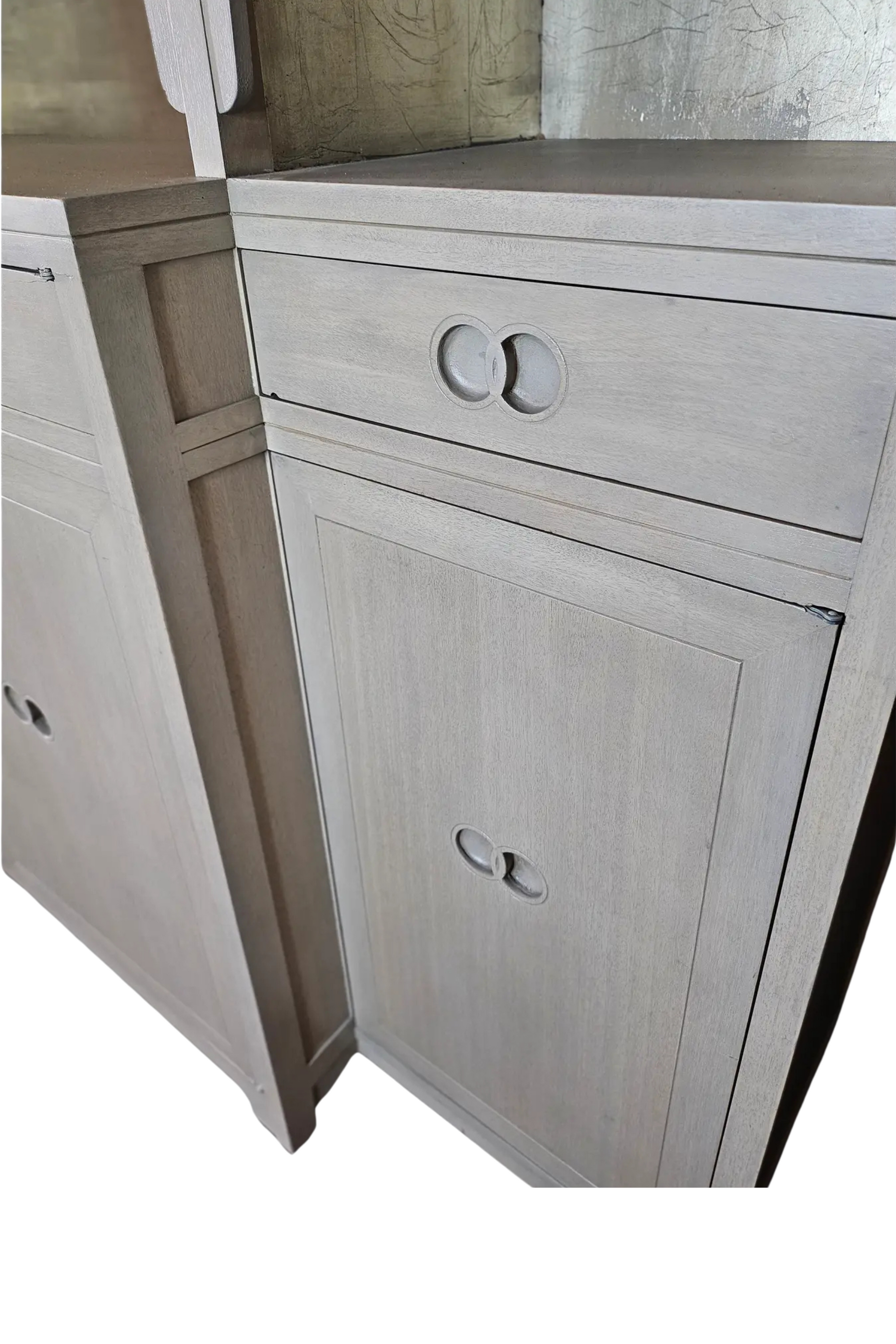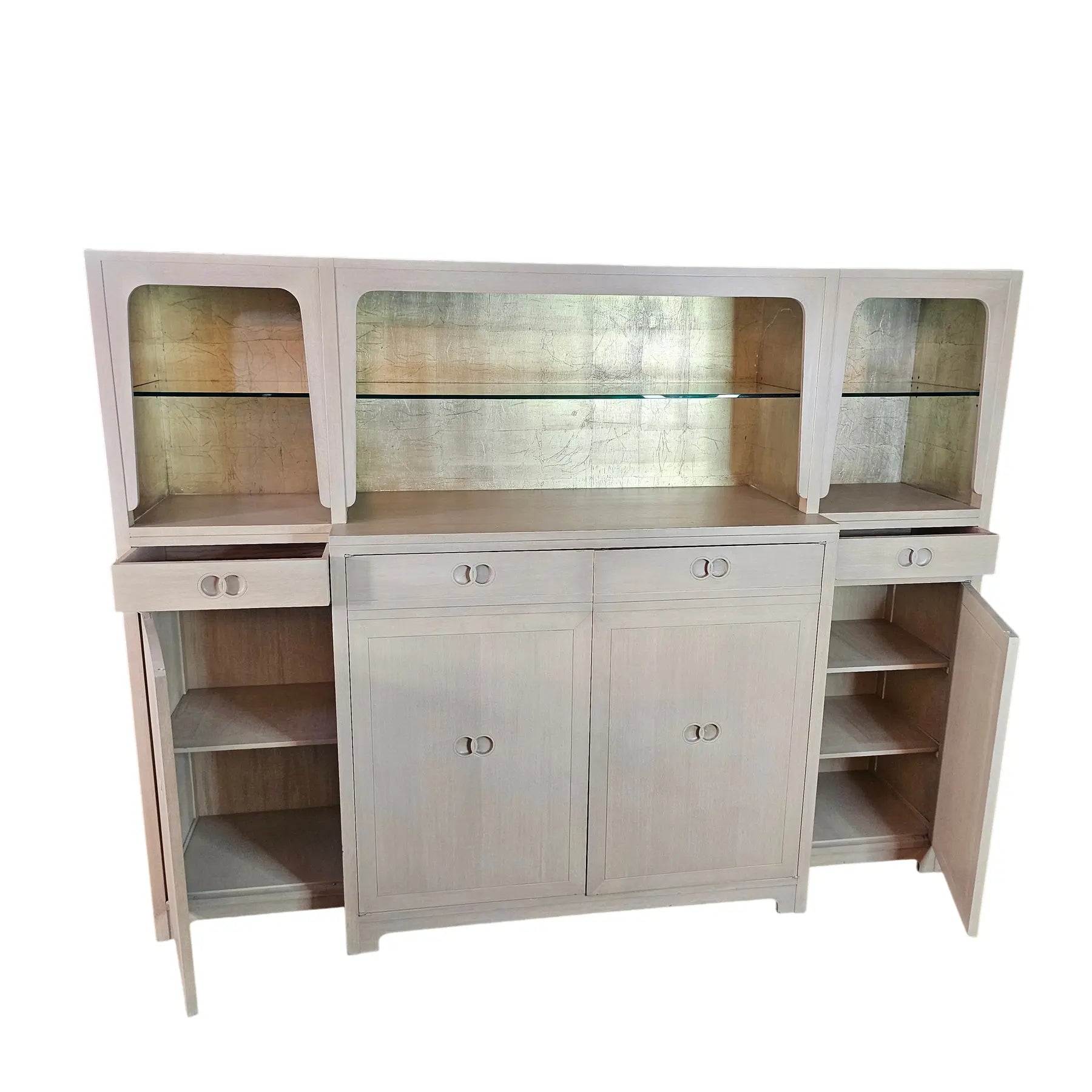 Beautiful China cabinet that could be used as a bar or to fit a TV inside as the shelves are removable or to fit the stereo equipment. It will look good in any room of the house. This was designed by Michael Taylor for the Baker furniture company in the 1970's. The cabinet has been refurbished the finish shows the grain of the bleached mahogany wood. Upper interior has a silver leaf finish that reflects the light nicely as it has integrated lighting on the upper section.